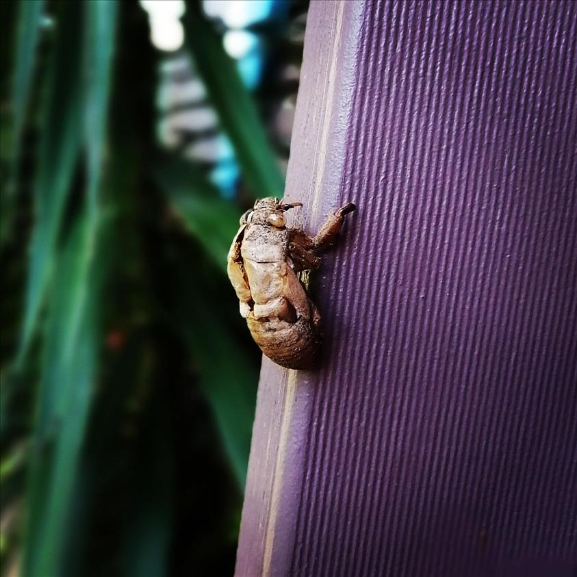 The shell left behind as a cicada changes from a nymph to an adult. You can see a large split from the head down the back to the abdomen the adult emerged from. Eliza Middleton