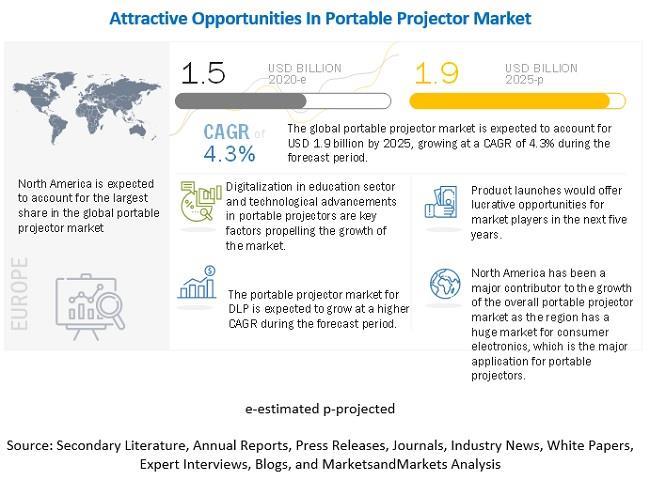 The report "Portable Projector Market with COVID-19 Impact Analysis, Technology (DLP,LCD, LCOS), Dimension (2D,3D), Lumen(Below 500, 500 to 3,000, Above 3,000), Resolution(VGA,XGA, HD & FHD), Projection, Application, and Region - Global Forecast to 2025″ , is projected to grow from USD 1.5 billion in 2020 to USD 1.9 billion by 2025; it is expected to grow at a CAGR of 4.3% from 2020 to 2025. The key factors fueling the growth of the market include digitalization in the education sector and technological advancements in portable projectors. Additionally, the reduction of the average selling price of portable projectors is also augmenting the growth of the portable projector market.