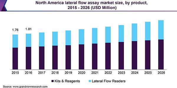 According to a report, ' Lateral Flow Assay Market Size, Share & Trends Analysis Report By Product (Kits & Reagents, Lateral Flow Readers), By End Use, By Application (Clinical Testing, Veterinary Diagnostics), By Technique, By Region, And Segment Forecasts, 2019 - 2026, lateral flow assays are cellulose based devices used in the detection of a target component in the liquid sample excluding the need for any specialized equipment. Growing prevalence of infectious disease is expected to remain pivotal for market growth in the coming years.