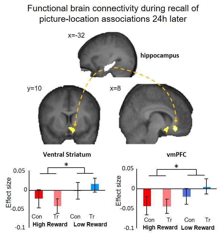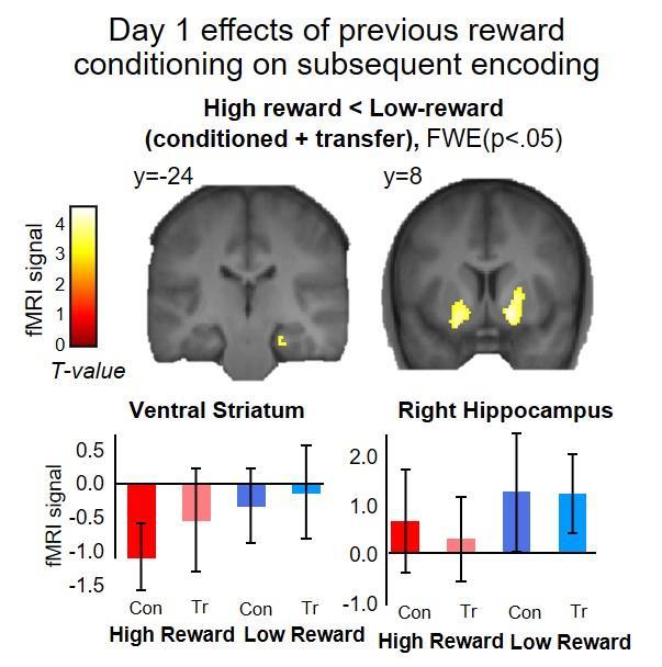 When their memory was tested 24 hours later, almost all of the participants had poorer memory accuracy for locations of those previously highly rewarded images. And most notably, the BOLD signal in the ventral striatum was surprisingly reversed: higher for low reward than for high reward, suggesting a perceived disappointment (or reward devaluation; a negative prediction error). Because the ventral striatum is tightly coupled with the hippocampus, the signal in the hippocampus was also decreased, even 24 hours later, and that is what led to poorer memory recall.