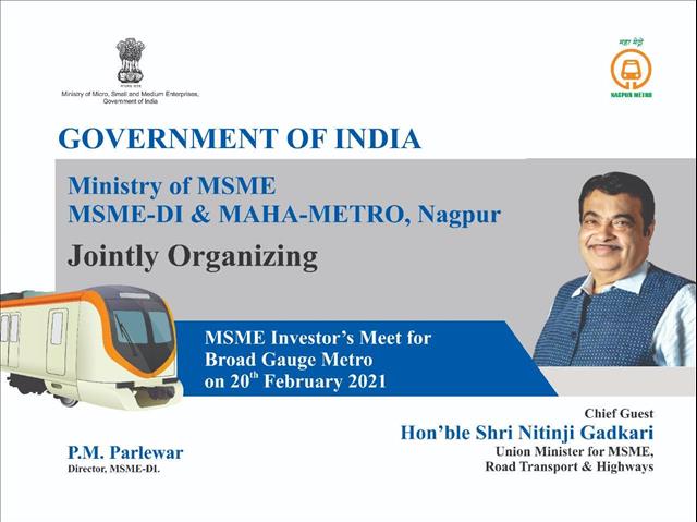 Nagpur, Feb 19 (KNN) Aiming to promote MSMEs for running broad gauge metro project in Nagpur, MSME-Development Institute, Nagpur in association with Maha Metro, Nagpur will be organizing MSME-Investors Meet for broad gauge metro on 20th February 2021 at Maha Metro Convention Hall, 1st floor, Air Port (South) Metro Station, Wardha Road, Nagpur at 10.00 A.M.