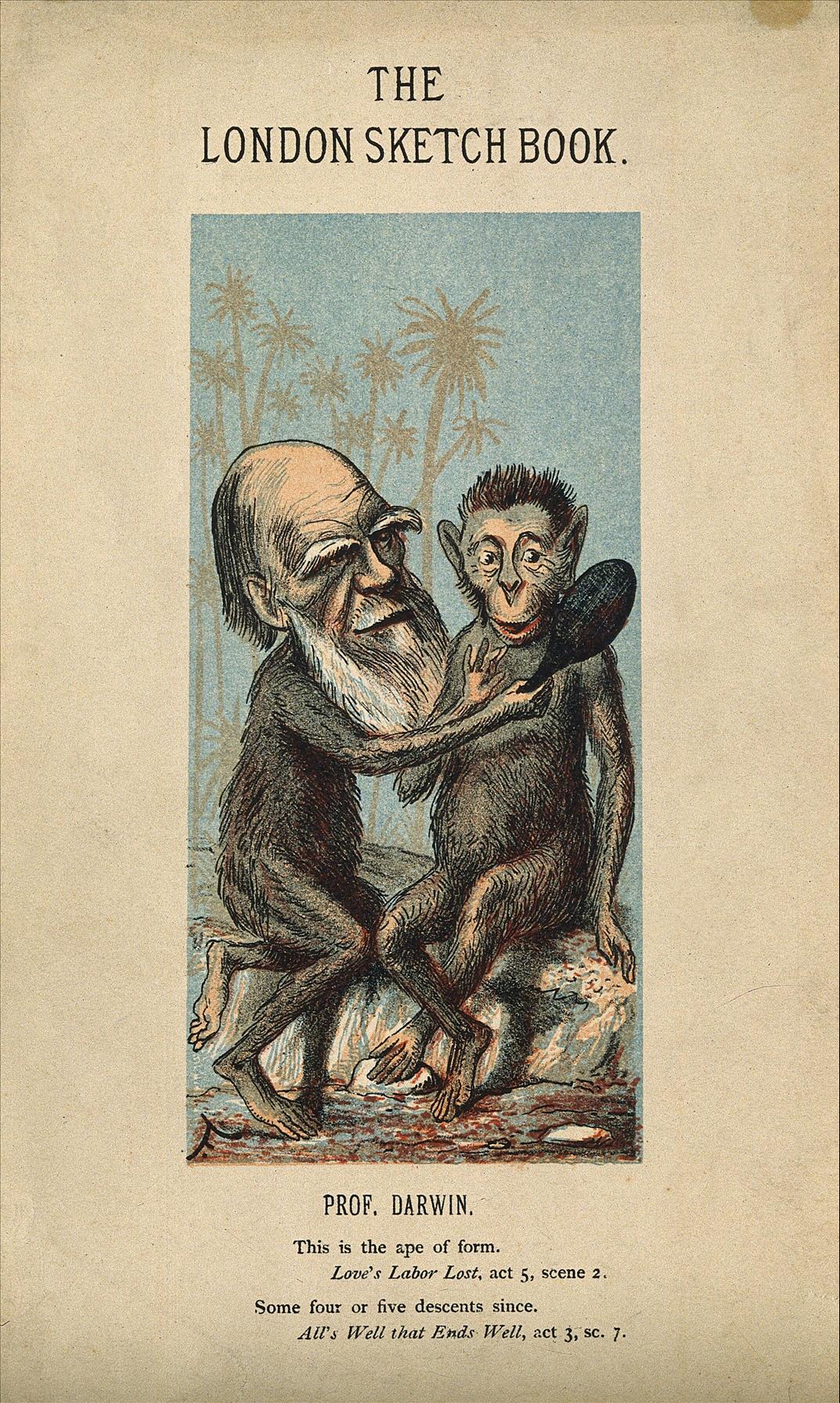 Darwin was frequently caricatured in the press as an ape, as here in a colour lithograph by F. Betbeder. Wellcome Collection, CC BY