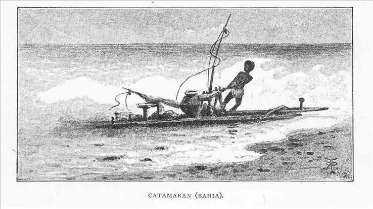 RT Pritchett's drawing of a catamaran off the Brazilian state of Bahia, as seen on the Beagle Voyage. Freshwater and Marine Image Bank at the University of Washington