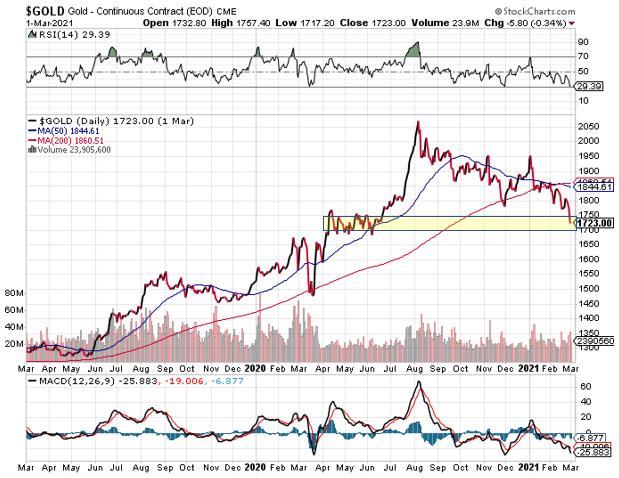 Last April to June there was a confluence of trading in the current range around $1700–$1,750. And the RSI and MACD indicators suggest gold is at or very near oversold levels.