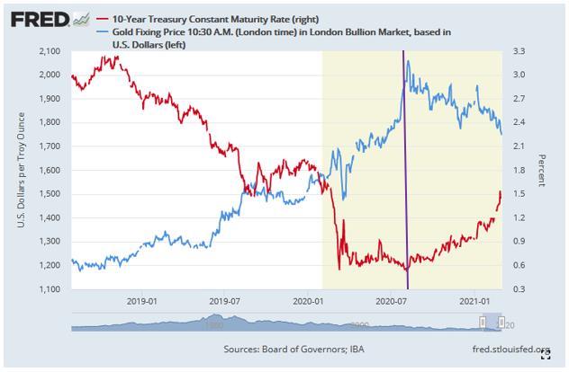 Bond yields have been on a path higher since early August. It's no coincidence that gold started to correct at virtually the same time. Gold pays no dividends. And investors have become attracted to higher bond yields as stocks have gotten even more pricey.