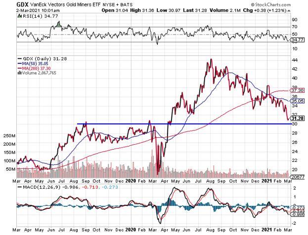 The bottom for GDX could well sit near the $30 level. The RSI suggests a little more work needs to be done.