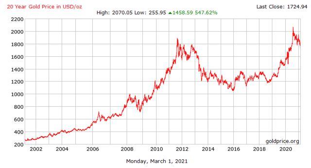 If we look at a 20-year gold chart, the recent correction takes on a different context.