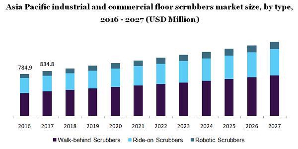 The global industrial & commercial floor scrubbers market size is anticipated to value USD 5.41 billion until 2027. It is also expected to register a CAGR of 5.1% over the forecasted years, 2020 to 2027. The increasing need for maintaining hygiene and cleanliness at public places is expected to propel the growth of the market.