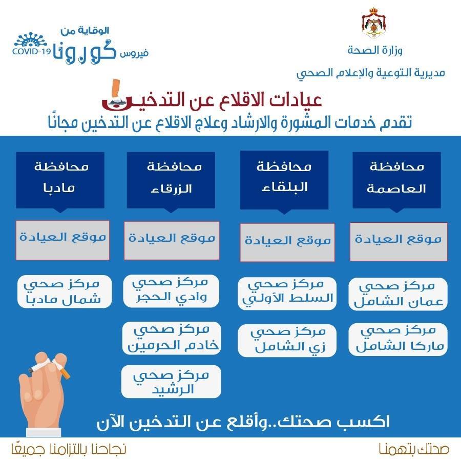 In the north, the Al-Sareeh center, Jerash center, comprehensive Mafraq center, Comprehensive Ajloun center, Comprehensive Al-Razi center, Hanina center and Qom center provide counseling smoking cessation services.