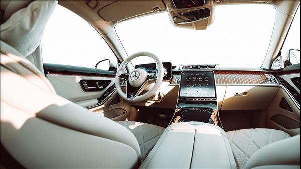The interior of the Mercedes-Maybach S-Class is based on the revolutionary interior design of the new Mercedes-Benz S-Class. The sculptured look of the dashboard, centre console and armrests appears to float above an expansive interior landscape. In the Mercedes-Maybach S-Class too, digital and analogue luxury are in harmony. Up to five display screens are available. Included as standard is a 12.8-inch OLED central display as a high-tech control centre. A 12.3-inch 3D driver display with three-dimensional representation of other road users and pronounced depth and shade effects is available on request.