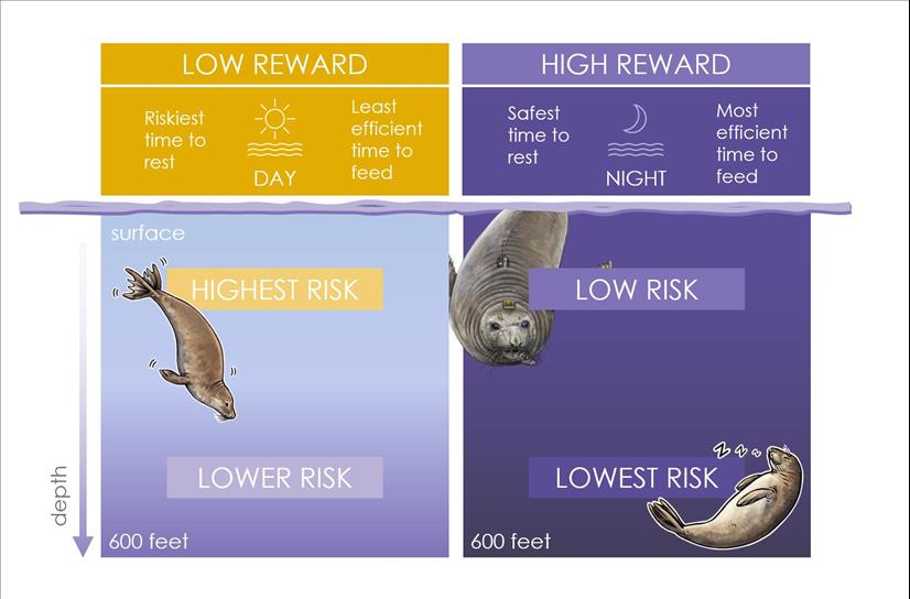 The ocean is a fascinating place to study risk and reward, because light levels determine life and death in three dimensions: The surface of the ocean is bright, and predators can hunt much more easily; but the light quickly fades as you dive deeper into the ocean. For elephant seals, light levels are directly related to risk, because their main predators inhabit shallow waters and use light to hunt . For elephant seals, resting is safer at night when predators can't find them.