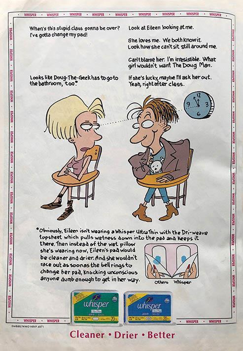 Ads in my survey also propagated the idea periods should be talked about in secret — and mostly woman to woman. Teenagers gossiping in private spaces were pictured in ads from 1939 to 1995.