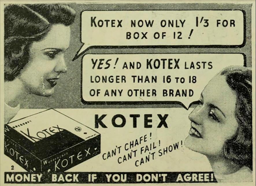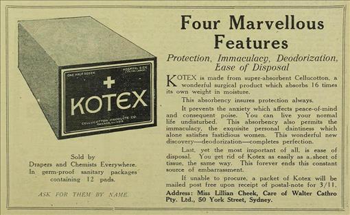 This 1926 Kotex ad from The Bulletin, shows a cross on the packaging and describes the pad as a 'surgical product'. Newspapers Collection, State Library Victoria.