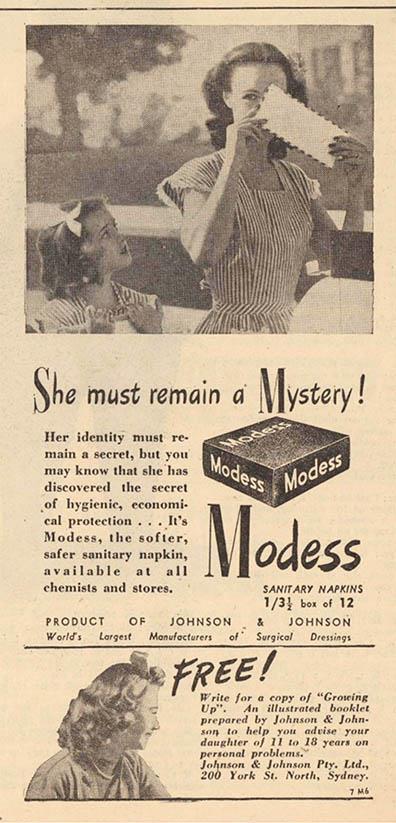 During the second world war, Australia had to tighten its belt to support the war effort. Brands like Johnson & Johnson concentrated their resources on producing surgical supplies for the armed forces, leaving pads in short supply. One of their ads was apologetic in tone: 'We trust you will bear with us, should you … find that your chemist or store has no stocks of … Modess Sanitary Napkins.'