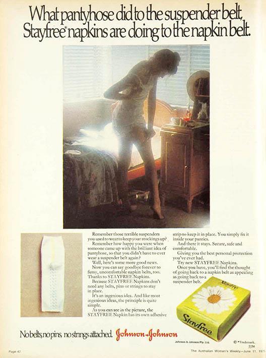 Women were commonly dressed in white as shown in this 1975 Stayfree ad from the Australian Women's Weekly. Author's own photograph.
