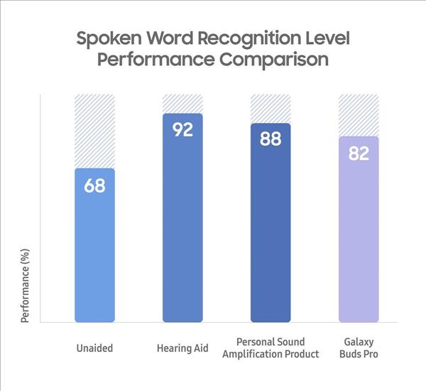 Finally, a clinical performance evaluation investigated changes in individuals' hearing levels both with and without the devices, and their ability to recognize words and sentences. Participants had mild to moderate hearing loss, with a median age of 63 years. Statistical significance was observed at 1,000Hz, 2,000Hz and 6,000Hz, meaning Galaxy Buds Pro sufficiently amplified sound at the three frequencies of speech pitches. Furthermore, in total, over 57 percent of the participants reported that Galaxy Buds Pro were able to help them communicate in a quiet environment.