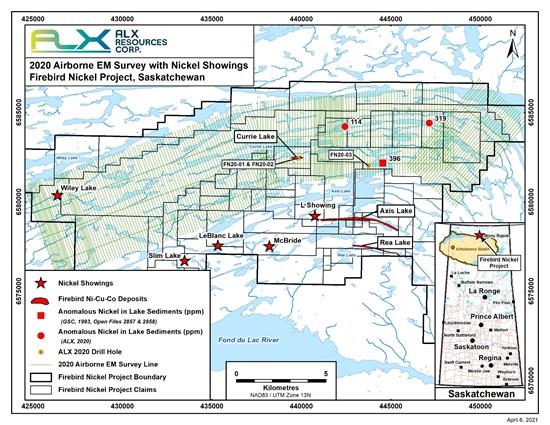 - The first drill holes of the program are planned in the northwestern part of Firebird at the Wiley Lake Showing area, where surface sampling by ALX has identified high-grade nickel showings (see ALX news release dated July 27, 2020 , "ALX Resources Corp. Samples up to 2.43% Nickel and 8.34 Grams/Tonne Gold in the Northern Athabasca Region, Saskatchewan").