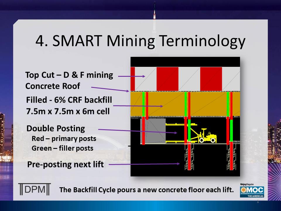 The easiest way to visualize SMART mining is to imagine that an underground orebody is just a large car parkade. The volume of ore between any 4 posts is a SMART cell. Each floor in the parkade becomes a SMART spreadsheet of equal sized cells. Mining proceeds below the bottom level of the parkade. The parkade is filled with cemented rock fill (CRF). However, a SMART cell filled with CRF weighs 800t whereas 4 parked cars weigh only 12 tons. Rock mechanic engineers were adament that the CRF loads would crush the 400t capacity posts. Penoles engineers had searched globally for a new mining method that could improve mining productivity and were intrigued enough to fund a Golder rock mechanics study. See Image # 4 for SMART Terminology