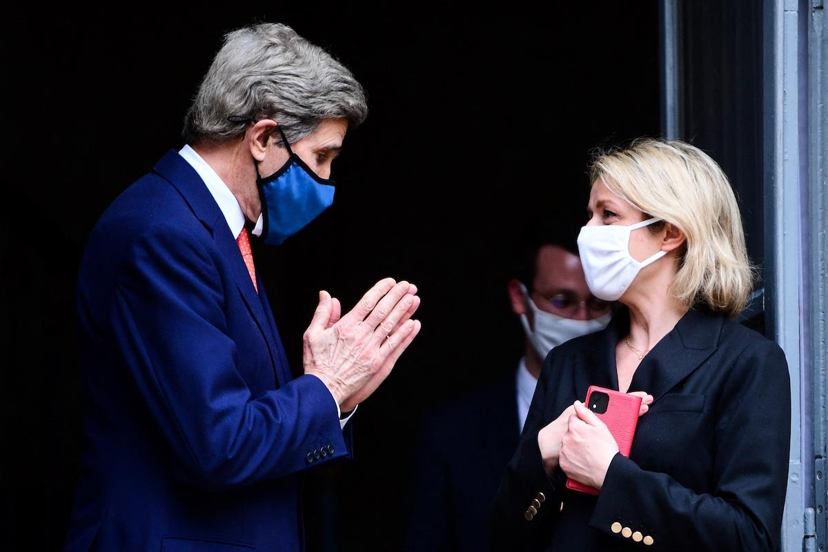 US climate envoy John Kerry (L) and French Ecological Transition Minister Barbara Pompili after their meeting in Paris on March 11, 2021. Kerry confirmed on March 10, 2021, the US would lay out new financing commitments for the Paris Agreement to cut greenhouse gas emissions ahead of an April 22 summit on the pact's fifth anniversary. Photo: AFP/Martin Bureau