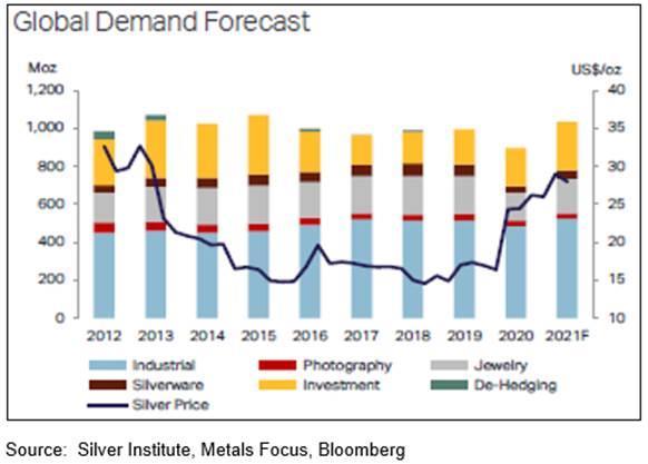 Silver in particular has the added benefit of 50% of its demand being industrial. With unprecedented economic stimulus programs, many favoring green energy, silver is uniquely positioned to profit. What's more, according to Metals Focus, silver supply was down 4% in 2020 by 42 million ounces. According to the Silver Institute, total supply will rise by 8% this year, though total demand will rise nearly twice as much, by 15%, led by industrial, jewelry and physical demand.