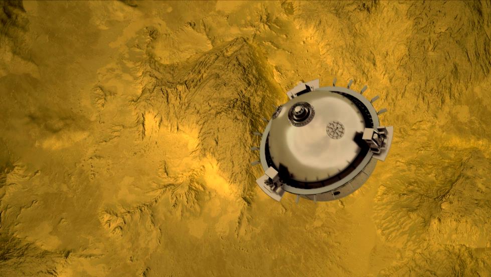 The DAVINCI+ probe will fall through the Venus atmosphere collecting samples and snapping photos before it ultimately collides with the Alpha Regio region. NASA GSFC visualization by CI Labs Michael Lentz and others