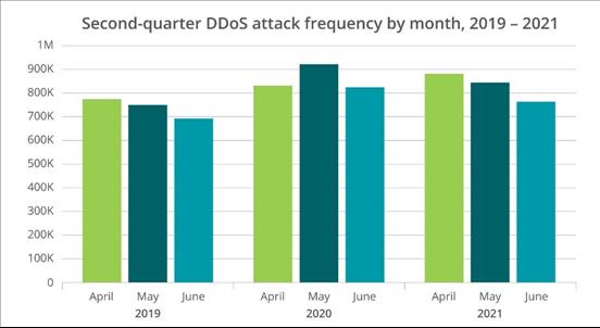 • The lowest monthly number of attacks for Q2 21 came in June, with 761,914 attacks. That low number nonetheless topped the high-water mark of Q2 2019: April’s 755,748 attacks.