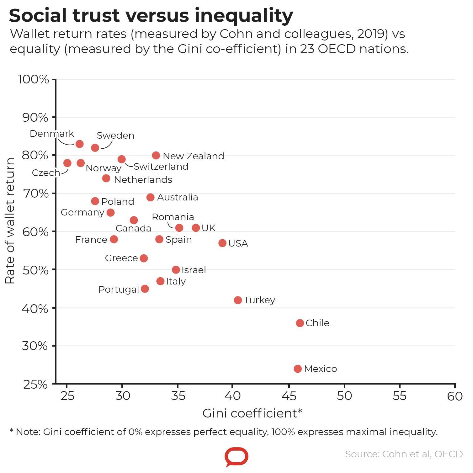 For my analysis of the relationship between trust, inequality and corruption, I've mainly used another“lost wallet” study published in 2019, by University of Michigan behavioural economist Alain Cohn and colleagues in Switzerland. Their study went one better than asking people about their expectations; it actually tested levels of trustworthiness by“losing” 17,000 wallets in 355 cities across 40 nations and measuring how many came back to their“owners”.