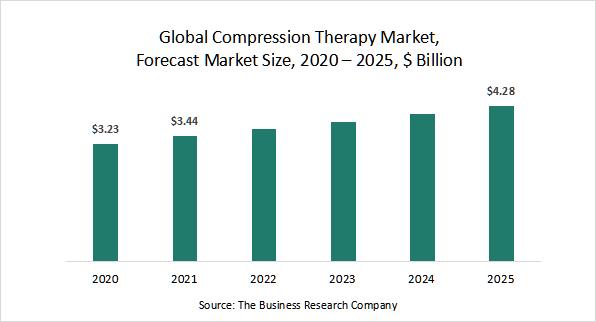 The global compression therapy market size is expected to grow from $3.23 billion in 2020 to $3.44 billion in 2021 at a compound annual growth rate (CAGR) of 6.3%. The growth is mainly due to the companies resuming their operations and adapting to the new normal while recovering from the COVID-19 impact, which had earlier led to restrictive containment measures involving social distancing, remote working, and the closure of commercial activities that resulted in operational challenges. The compression therapy market is expected to reach $4.28 billion in 2025 at a CAGR of 5.6%. The rise in the geriatric population is contributing to the growth of the compression therapy market.