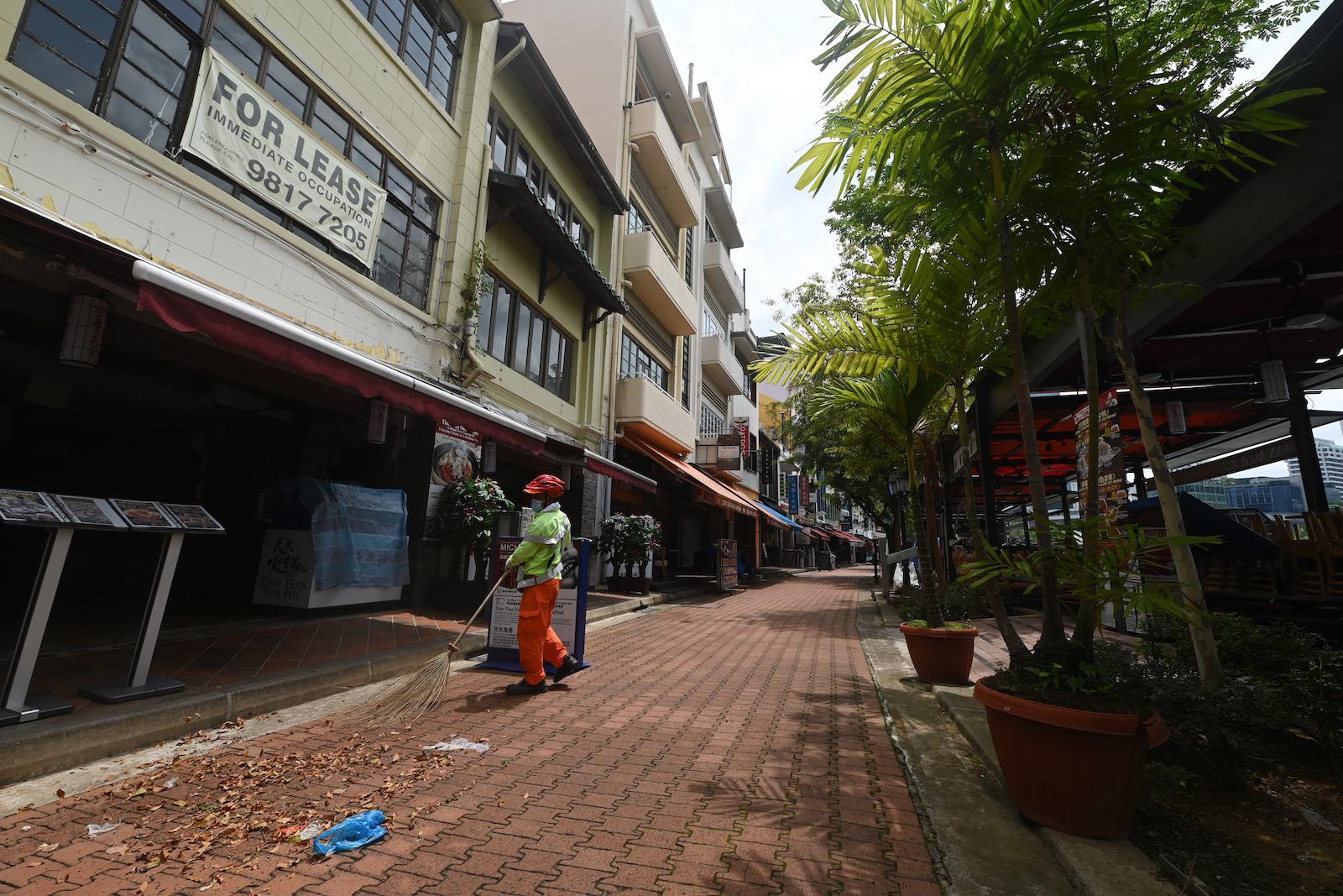 A worker sweeps a quiet alley along Boat Quay in Singapore on August 5, 2021. Photo: AFP / Roslan Rahman