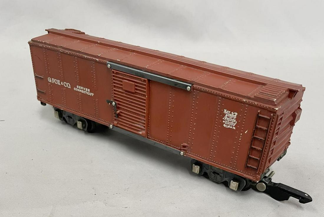 Exceedingly rare American Flyer G. Fox & Co. S gauge toy boxcar train, from a very limited production set made in 1946, Tuscan painted on white mold with nice lettering ($18,975).
