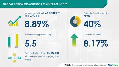 The screw compressor market in the Electrical Components & Equipment industry is poised to grow by $ 5.5 bn during 2021-2025. Technavio's latest market research report estimates that the screw compressor market will be progressing at a CAGR of 8.89%. This report offers an up-to-date analysis regarding the current market scenario, the latest trends and drivers, and the overall market environment.