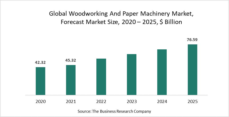 The global woodworking and paper machinery market size is expected to grow from $42.32 billion in 2020 to $45.32 billion in 2021 at a compound annual growth rate (CAGR) of 7.1%. The growth is mainly due to the companies rearranging their operations and recovering from the COVID-19 impact, which had earlier led to restrictive containment measures involving social distancing, remote working, and the closure of commercial activities that resulted in operational challenges. The market is expected to reach $76.59 billion in 2025 at a CAGR of 14%.