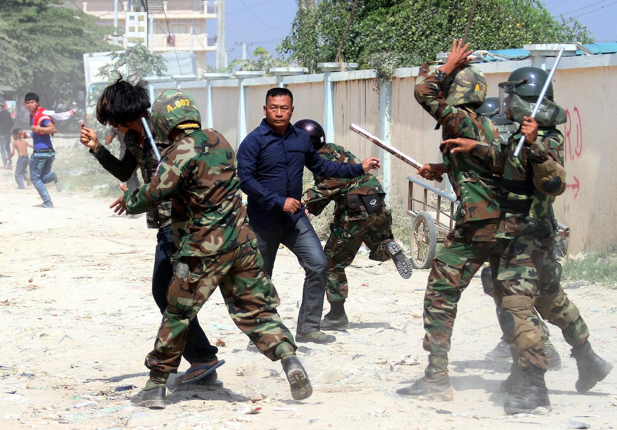 Cambodian soldiers clash with protesters during a garment workers' protest to demand higher wages in front of a factory in Phnom Penh on January 2, 2014. Photo: AFP / Siv Channa Voices muffled