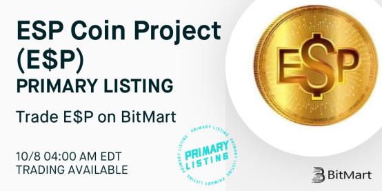 (MENAFN- Hmedium.com) BitMart, a premier global digital asset trading platform, will list ESP Coin Project (E$P) on October 8, 2021. For all BitMart users, the E$P/USDT trading pair will be officially available for trading at 4:00 AM EDT.