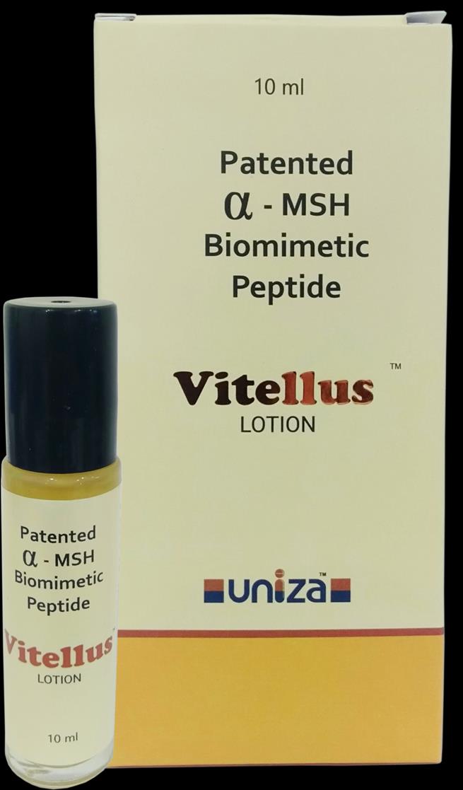 Vitellus is a novel combination of Greyverse, Melitane, GL 200 & EUK-134 which is an advanced new age solution for management of Vitiligo. Vitellus lotion is a 3 in 1 solution and helps in growth of melamine and works on skin pigmentation, hair follicle pigmentation and also as a super antioxidant. Greyverse stimulates melanogenesis & pigmentation and decreases in oxidative stress, EUK - 134 decreases oxidative stress and H2O2 Production while Melitane helps in promoting re-pigmentation of skin by stimulating melanogenesis and decreasing inflammation.