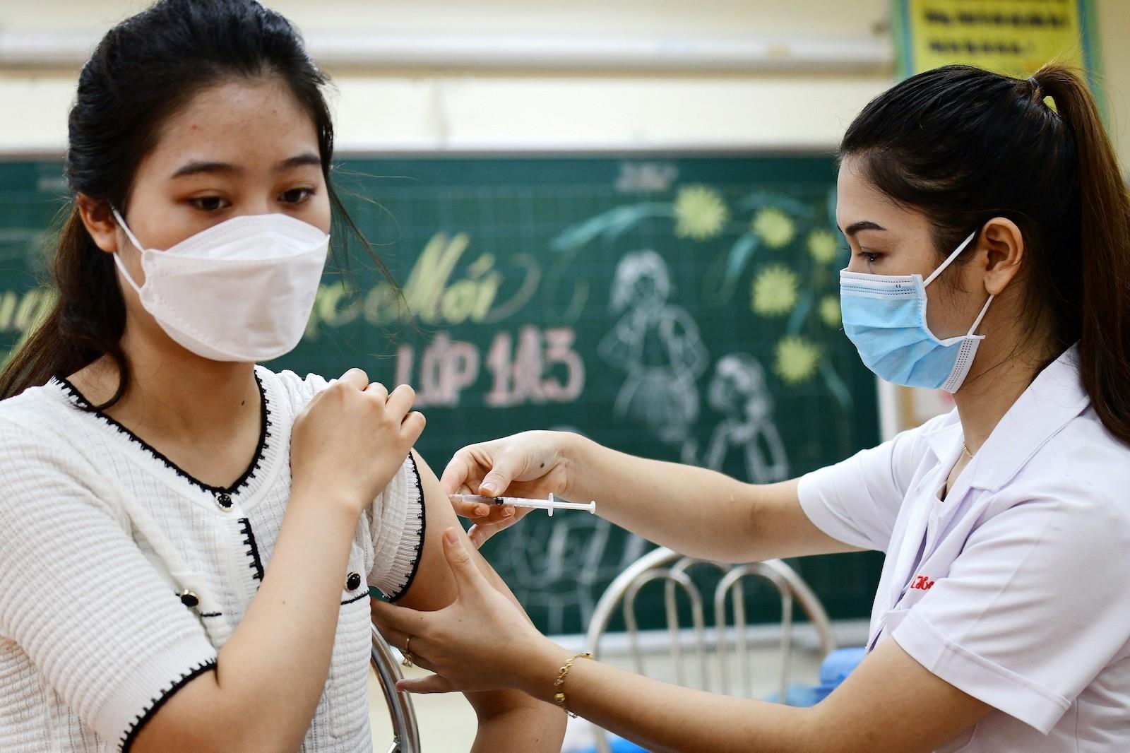 A woman (L) receives the Sinopharm Covid-19 coronavirus vaccine in Hanoi on September 10, 2021. Photo: AFP / Nhac Nguyen
