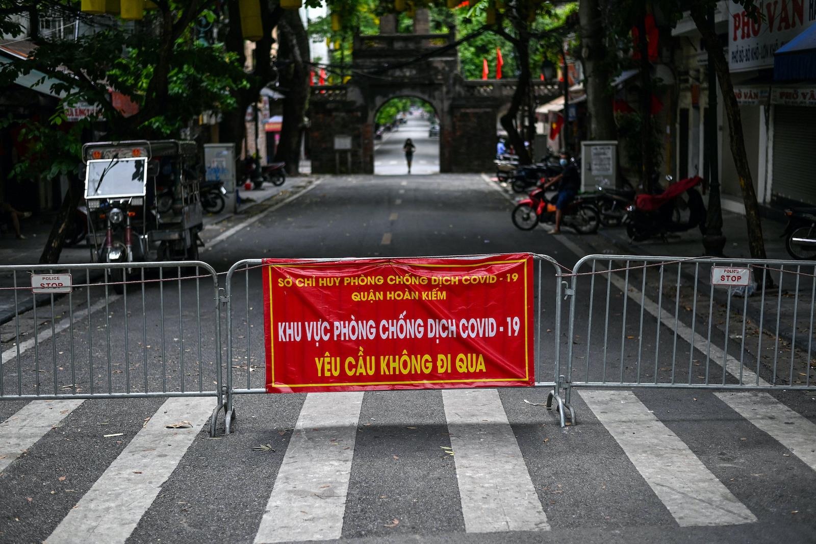 An improvised barricade installed in the middle of a street to restrict residents' movements in Hanoi, as part of the authorities' plan to stop the spread of the Covid-19 coronavirus, August 30, 2021. Photo: AFP / Manan Vatsyayana