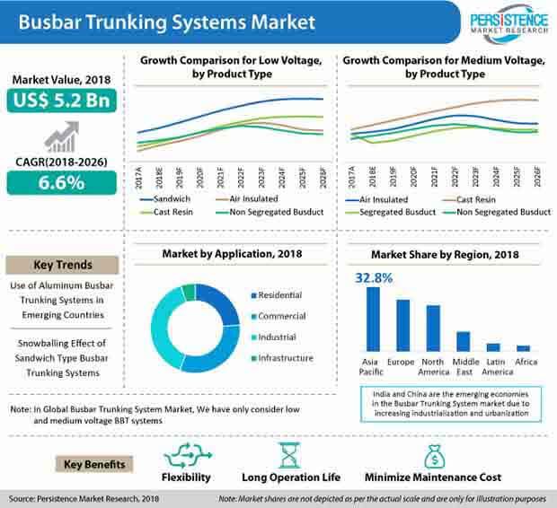 (MENAFN- iCrowdNewsWire) In a new research report on global bus bar trunking systems market by Persistence Market Research, only low and medium voltage bus bar trunking systems have been covered for in-depth analysis. It is expected that, the low voltage bus bar trunking systems segment will drive the growth of the bus bar trunking systems market, in terms of both, volume and value. The approximately US$ 5 billion market for bus bar trunking systems is projected to grow at a healthy CAGR of 6.6% during 2018-2026, as indicated by the PMR report.