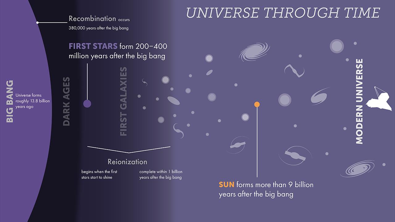 Astronomers would love to study this fascinating and important era of the universe, but detecting first light is incredibly challenging. Compared to massive, bright galaxies of today, the first objects were very small and due to the constant expansion of the universe, they're now tens of billions of light years away from Earth. Also, the earliest stars were surrounded by gas left over from their formation and this gas acted like fog that absorbed most of the light. It took several hundred million years for radiation to blast away the fog . This early light is very faint by the time it gets to Earth.