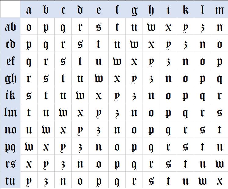An encryption table for the Bellaso / Della Porta cipher, invented in Italy in 1553. Only ten rows are shown, as wx / yz were not in the key.
