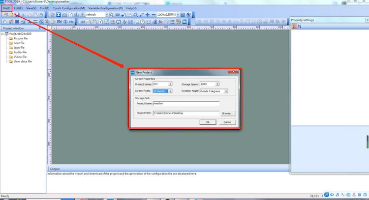 Select New Project, set the screen size to 1024*600, set the project name to weather, and finally select the path where the project needs to be saved, then click OK.