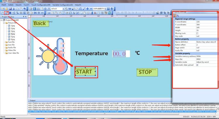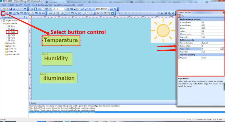 First add a button control to the temperature, select “button” control, and draw the corresponding area; then in the right feature settings, set the button effect, here select page 2, that is, when the button is pressed, the corresponding area to display the effect of page 2; then select the page switch function, here select the No. 4 page, that is, when this button is pressed, the page will immediately switch to page 4, that is, the temperature display interface.
