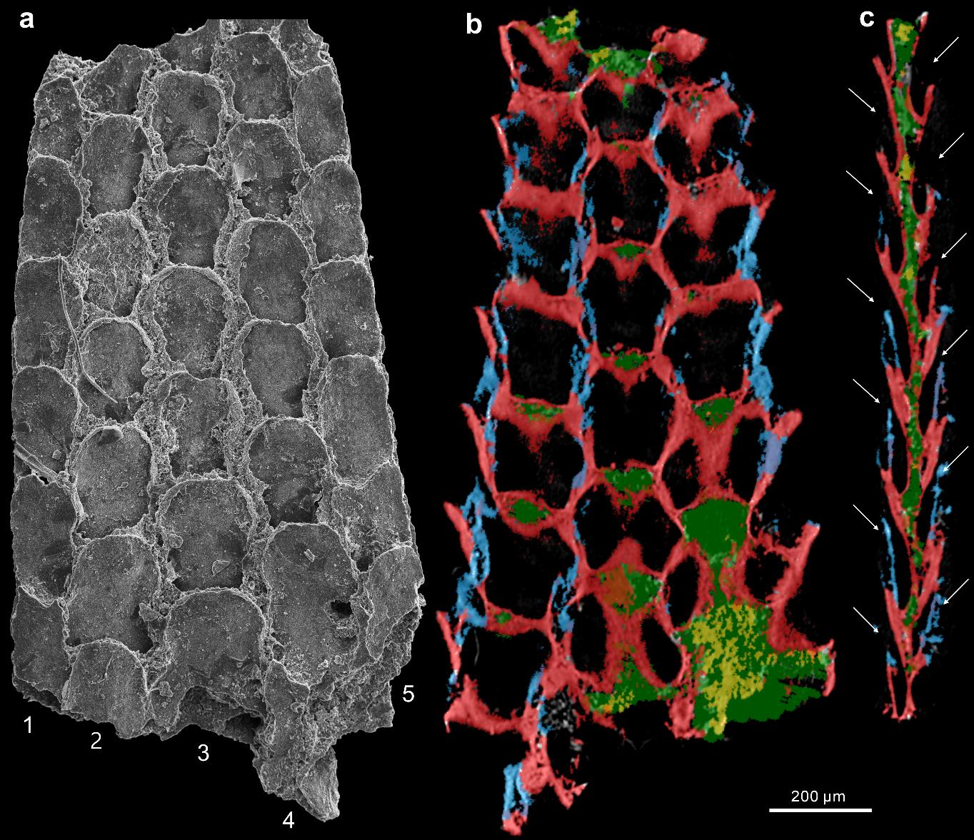 The early Cambrian bryozoan Protomelission gatehousei from the Flinders Ranges, South Australia. Image a shows a scanning electron microscope image of a colony with individual capsules, called zooids, that held separate individuals of the colony. Images b and c show internal structures from different orientations revealed by microCT. Colours are added to show different structures. Zhang et al./Nature , Author provided