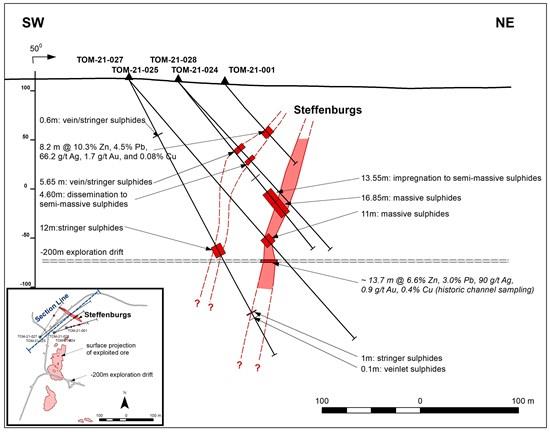 - Wide and high grade polymetallic mineralization encountered: Hole TOM21-028 intersected 30.4 m of continuous intense sulphide mineralization (143.6 to 174.0 m) including 13.55 m of impregnation to semi-massive sulphides (143.6 to 157.15 m), and 16.85 m of massive sulphides (157.15 to 174.0 m) at the Steffenburgs zone (Figure 1).