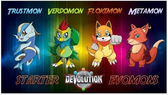 Devolution has already released four of their Evomons: Flokimon, Verdomon, Metamon and Trustmon. Each of these Evomons has three different evolutions; some Evomons will also have special evolution that goes beyond the Legendary Evolution.