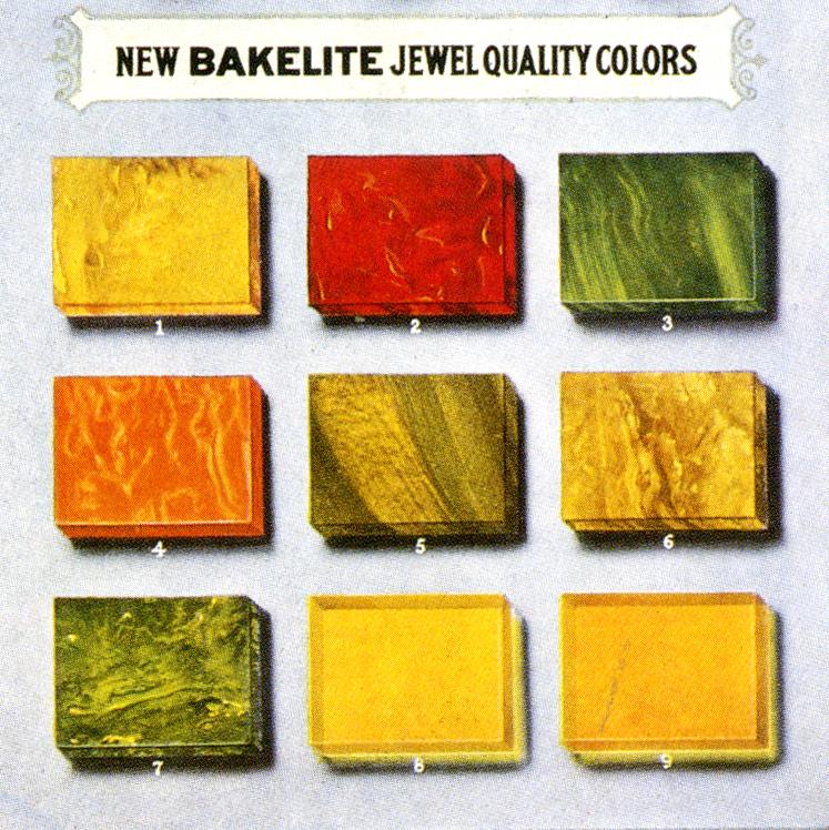 Colour chart for Bakelite 'jewel' quality colours, 1924. Bakelite was the first plastic made from synthetic components. Wikimedia Commons