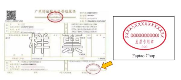 (5) Invoice (Fapiao) Chop: The invoice in China (fapiao) usually refers to the legal receipt as proof of purchases and sales of goods, provision or acceptance of services and in other business activities. Such fapiao is required to be stamped with the fapiao chop.