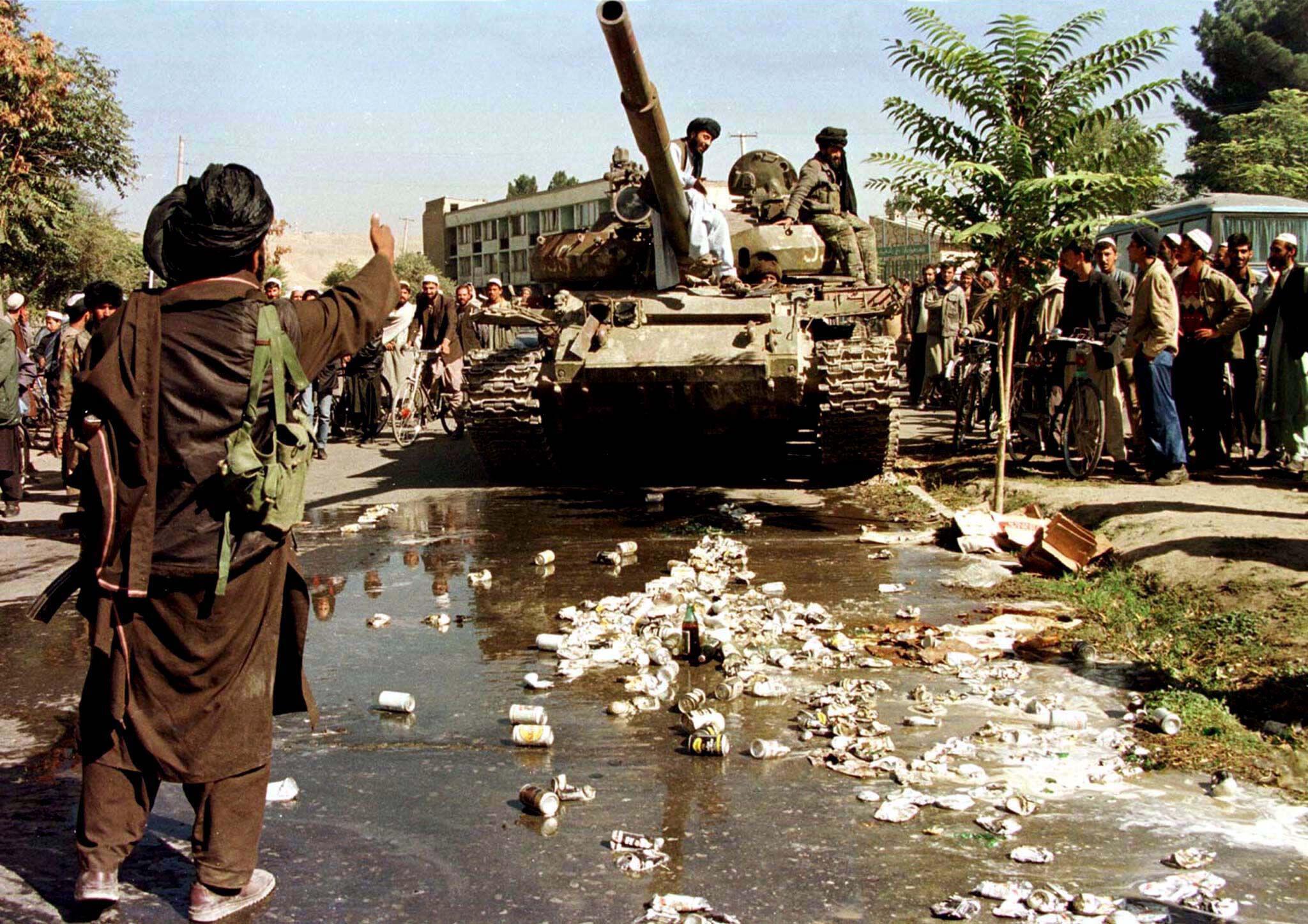 Taliban fighters in a tank drove over beer cans a dozen times, spraying beer over bystanders to demonstrate their loathing of alcohol. October 24, 1996. Reuters/Alamy