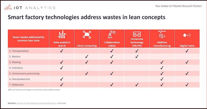 Even though the“Lean” methodology in its purest form avoids significant technological assistance, many practitioners now try to use various smart factory technologies to help eliminate different wastes. The picture below shows some selected smart factory technologies and which of these can help with which forms of waste.