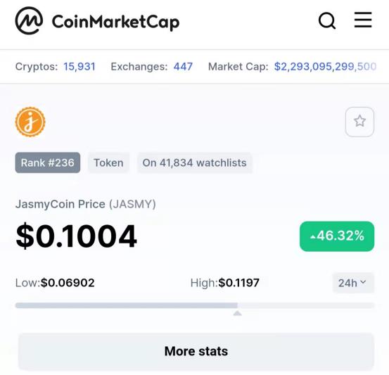 As of the time of publication, the real-time price of JasmyCoin was US$0.101271, and the 24-hour trading volume was US$652,930,065. It has risen by 46.32% in the past 24 hours, and its real-time market value is US$481,536,711.
